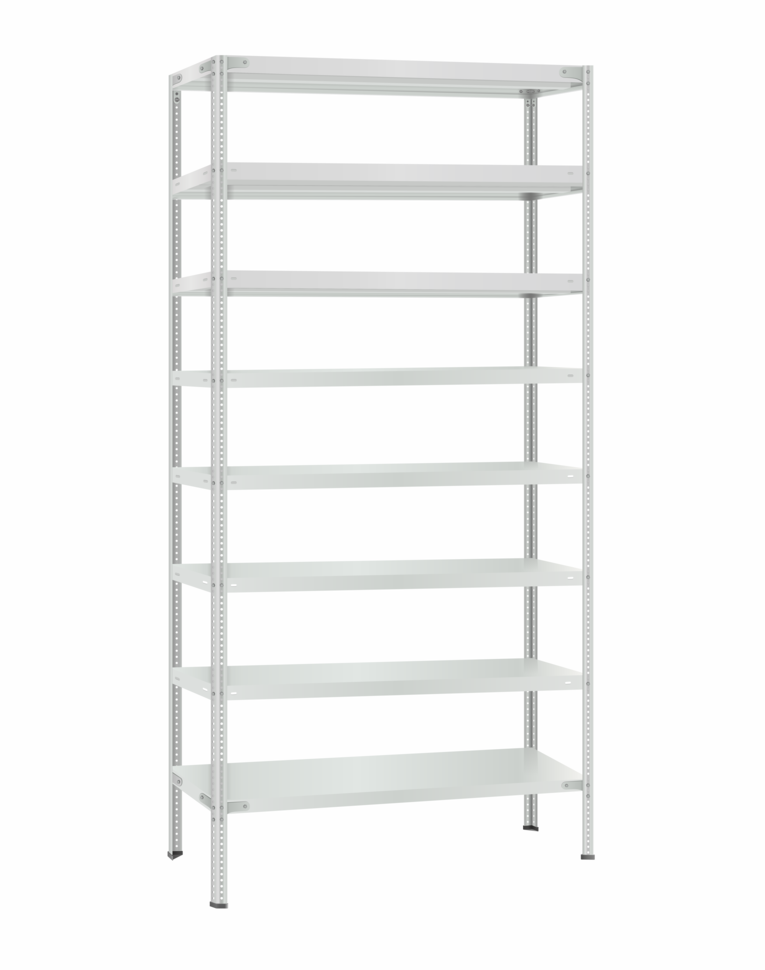 Полки МС Титан изготовлены из высокопрочной стали, покрыта полимерным порошковым покрытием светло серого цвета RAL 7035 типа шагрень